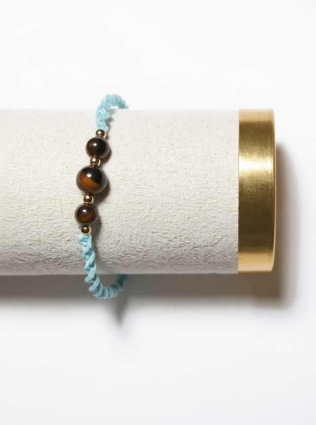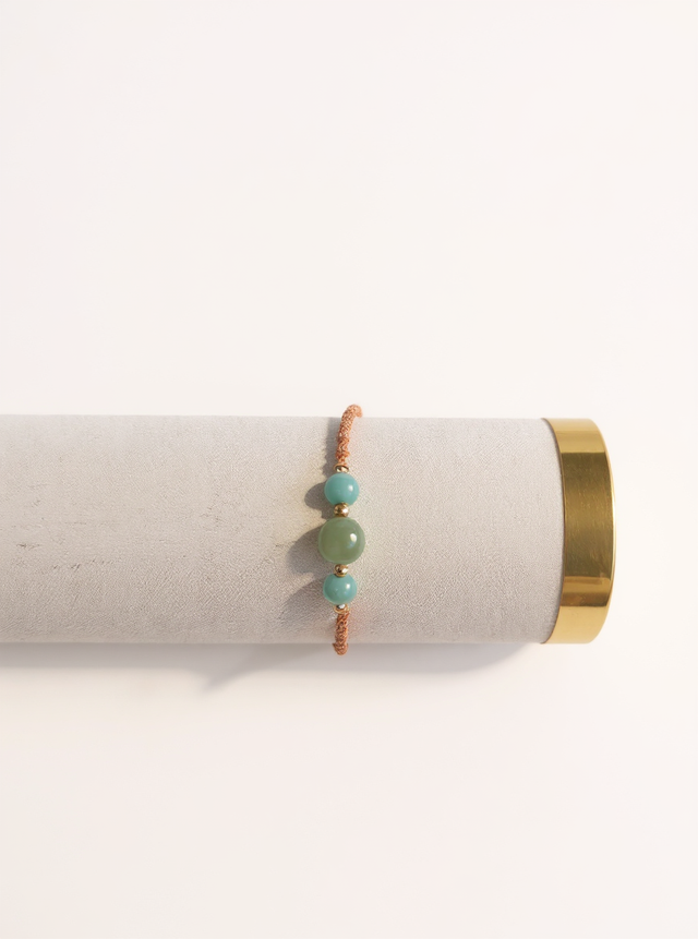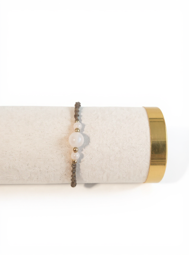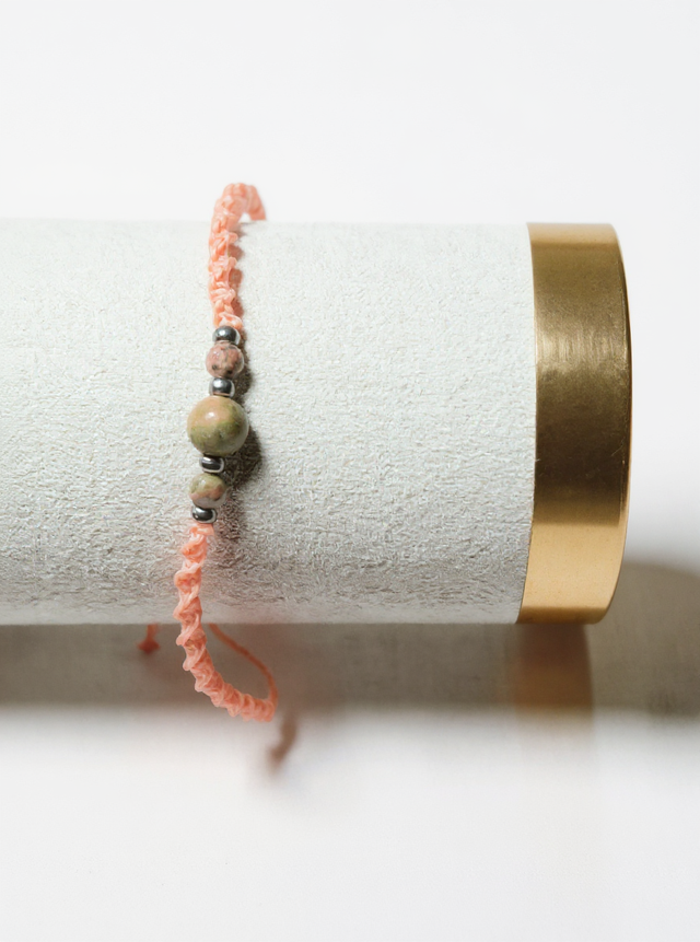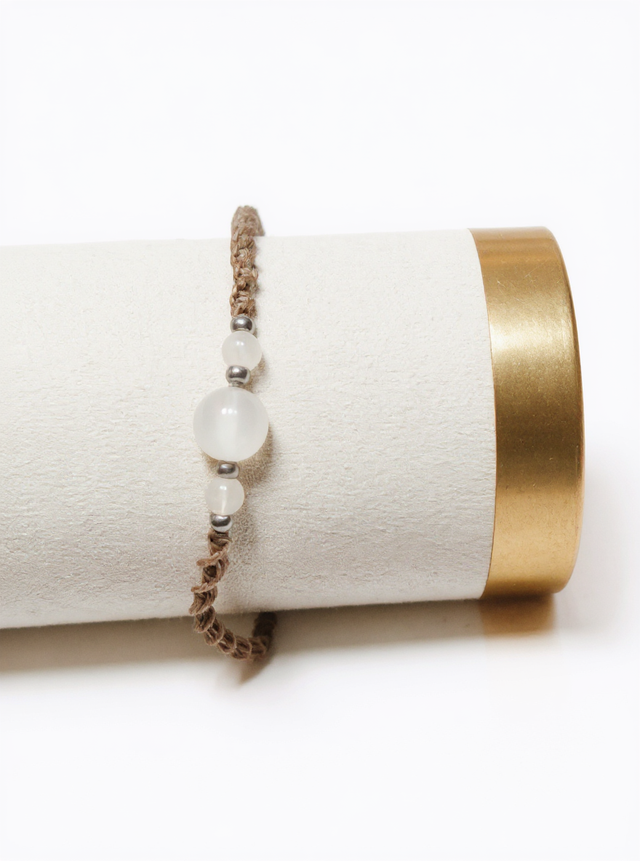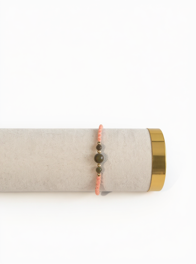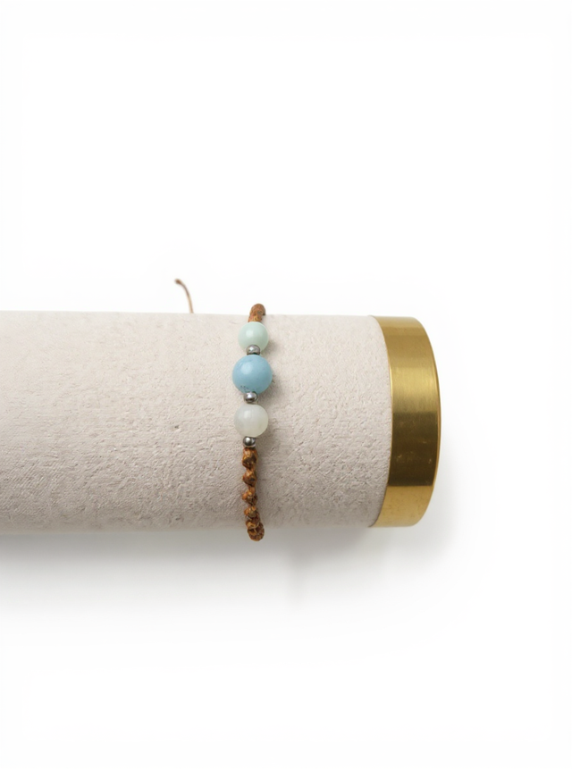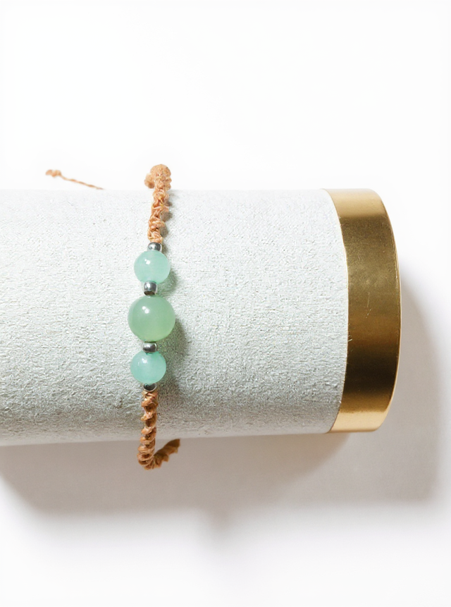 Selon le modèle, il est composé d’une pierre centrale de 8 mm entourée de deux perles de 6 mm, ou d’une pierre centrale de 6 mm accompagnée de perles délicates de 4 mm. J’y ai ajouté des perles en acier inoxydable argenté ou doré pour un éclat moderne tout en restant fidèle à mon style artisanal. Chaque bracelet est tissé à la main et possède un système réglable qui s’adapte à tous les poignets. Une création légère, harmonieuse et pleine d’authenticité.