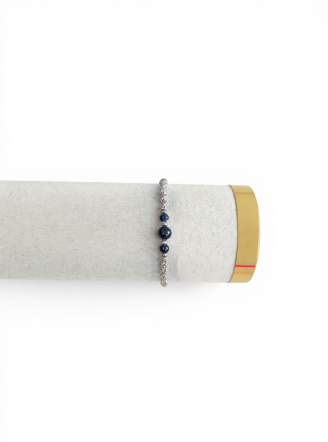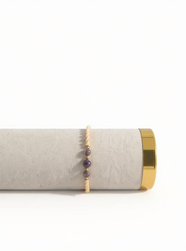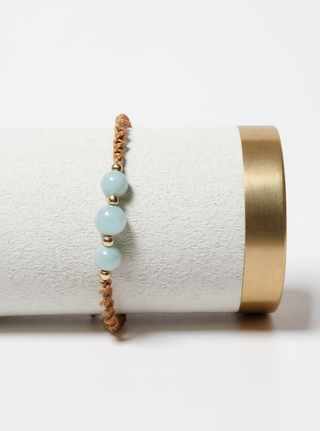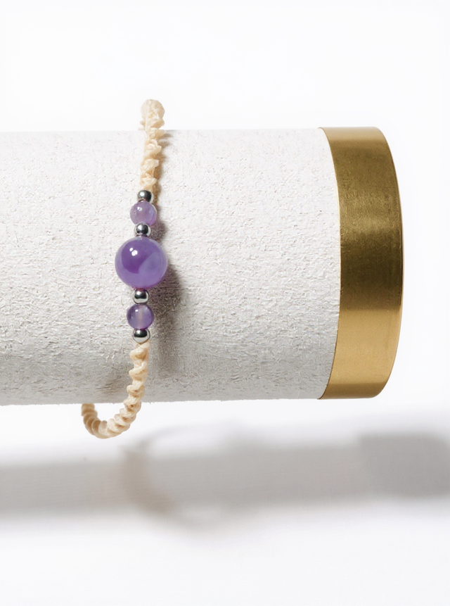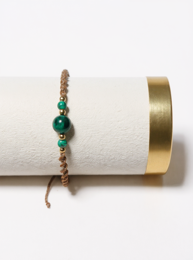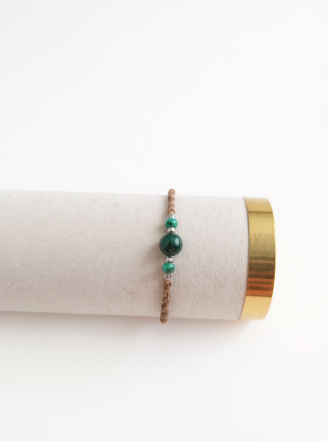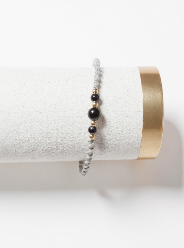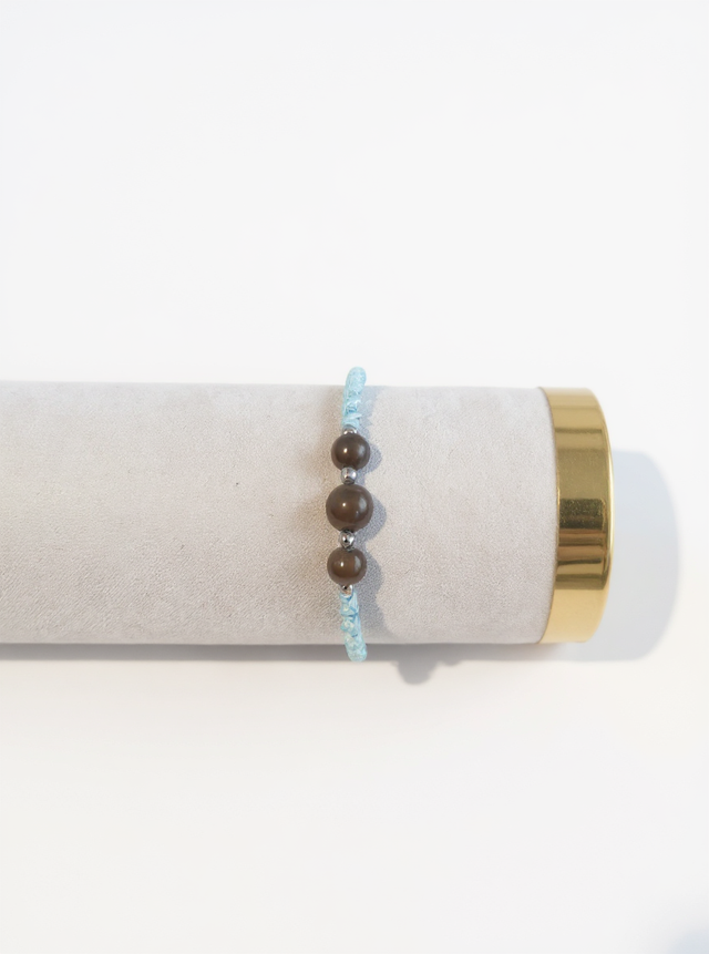Selon le modèle, il est composé d’une pierre centrale de 8 mm entourée de deux perles de 6 mm, ou d’une pierre centrale de 6 mm accompagnée de perles délicates de 4 mm. J’y ai ajouté des perles en acier inoxydable argenté ou doré pour un éclat moderne tout en restant fidèle à mon style artisanal. Chaque bracelet est tissé à la main et possède un système réglable qui s’adapte à tous les poignets. Une création légère, harmonieuse et pleine d’authenticité.