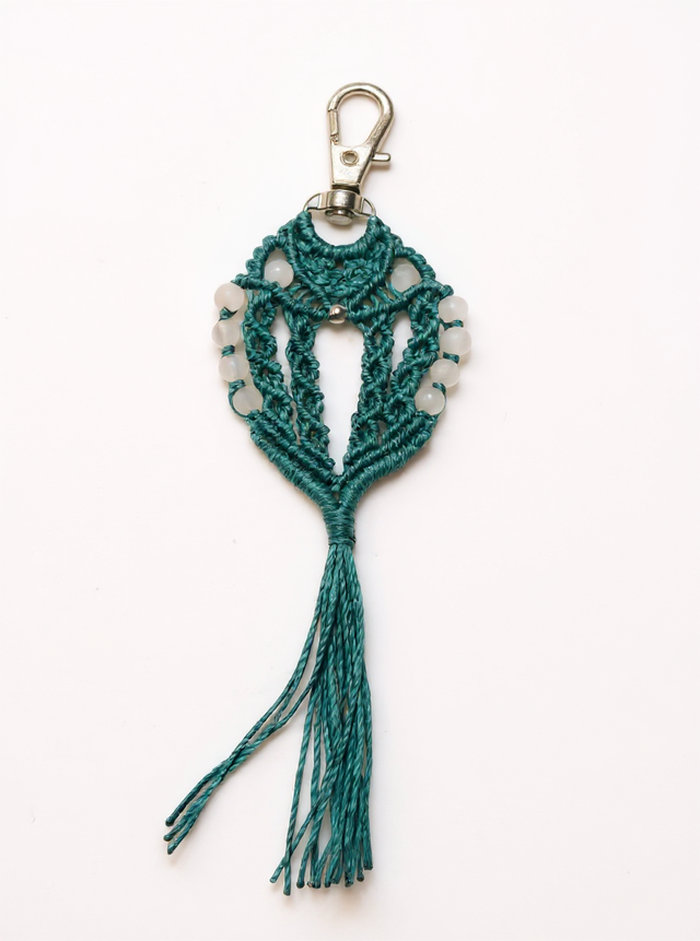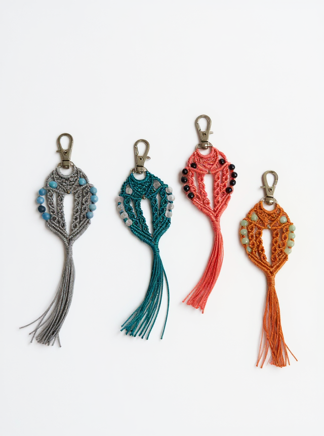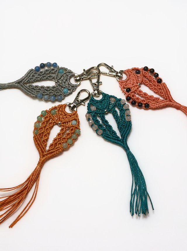 J’ai imaginé ces portes-clés en forme d’hibou pour apporter une touche ludique et artisanale à vos clés ou sacs. Chaque hibou est tissé à la main en micro-macramé avec minutie et décoré de dix perles naturelles, qui ajoutent éclat et originalité. Disponibles en quatre modèles différents. Un petit bijou pratique et poétique qui accompagnera votre quotidien avec charme et authenticité.